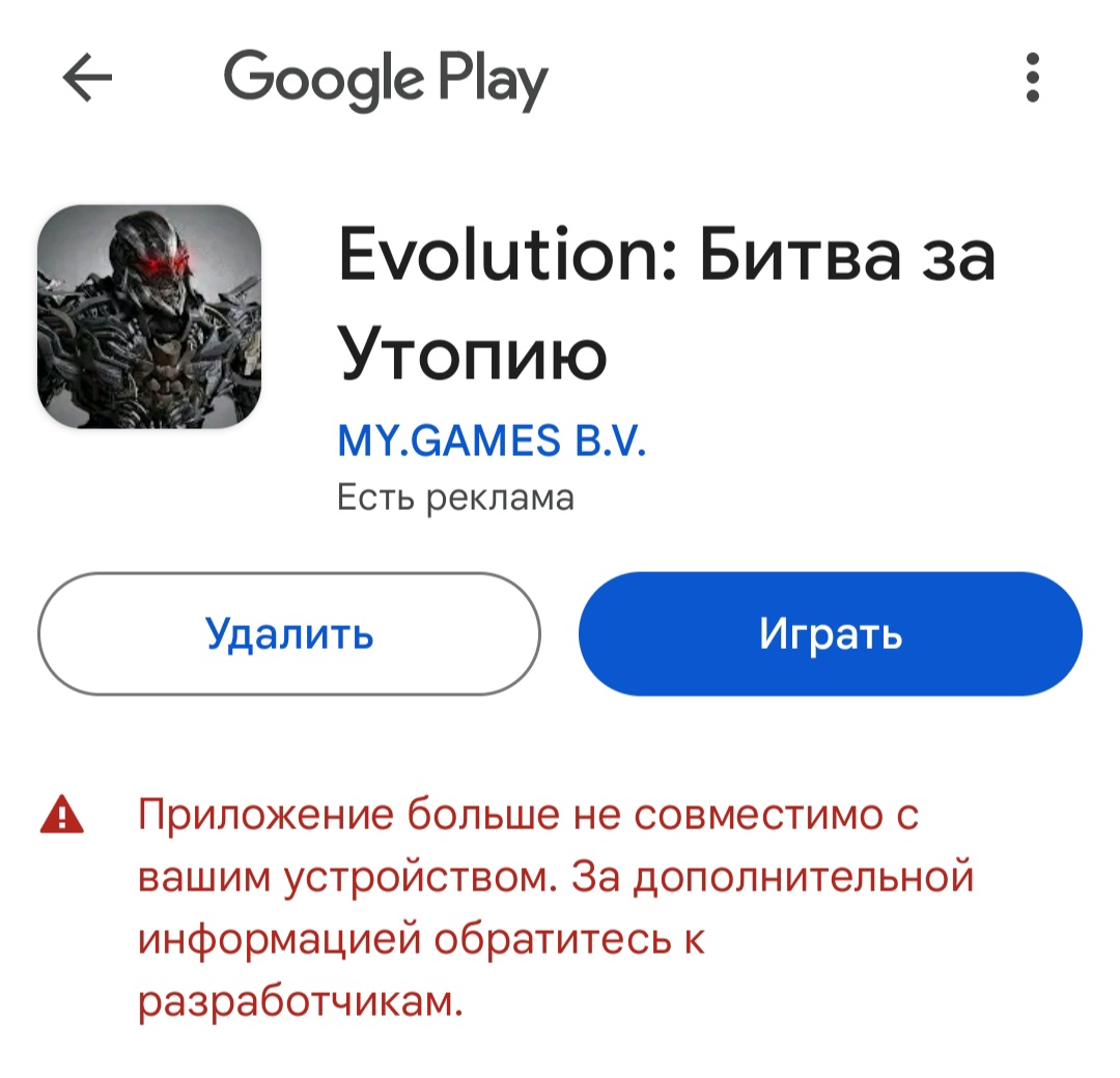 1. Столкнувшись с проблемой, я безуспешно пытался отключать Интернет, врубать VPN, чистить кэш (предварительно сделав его резервную копию в отдельную папку). Ожидаемо, это проблему не решило, а потому игру с телефона снёс, оставив кэш в отдельной папке. При этом игру с Play Market поставить вновь не мог, так как в приложении она не находилась, а при попытке открыть в браузере (с VPN) я видел абсурдное сообщение с приложенного скрина о том, что игра на моём устройстве не поддерживается, хотя до этого я спокойно в неё гамал, попутно снимая видосы — проблем с железом точно не было. Короче, в этот момент я сразу понял, что Play Market мне не поможет.